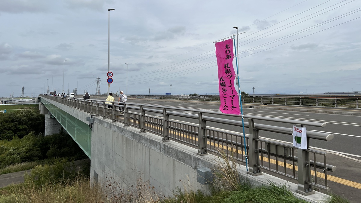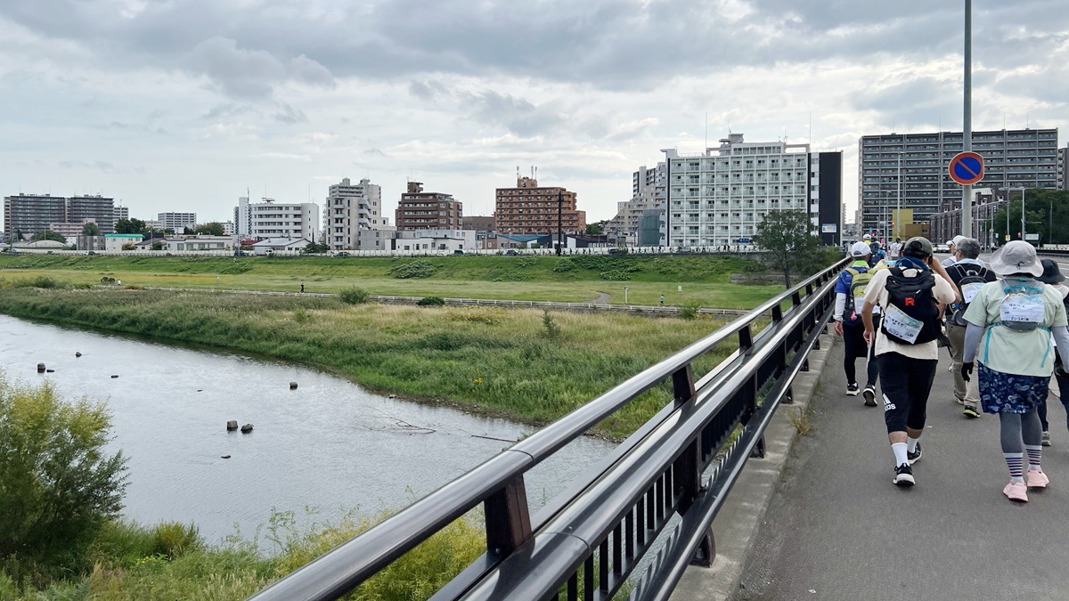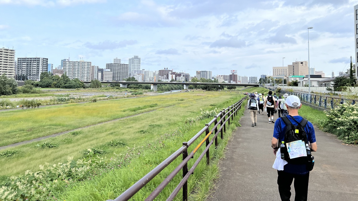 スタートの中島公園を抜け、豊平川の河川敷を南大橋から北24条桜大橋まで歩きます。豊平川の河川敷は整備されているため歩きやすく、広々とした空の下で札幌の街並みや山並みを背景に豊平川の雄大な流れを感じながら歩けるのが魅力です。