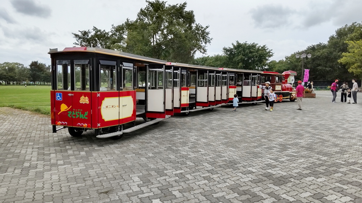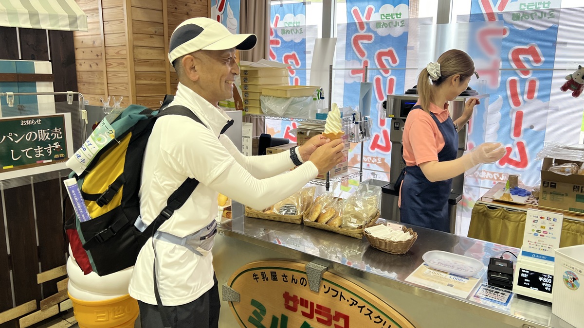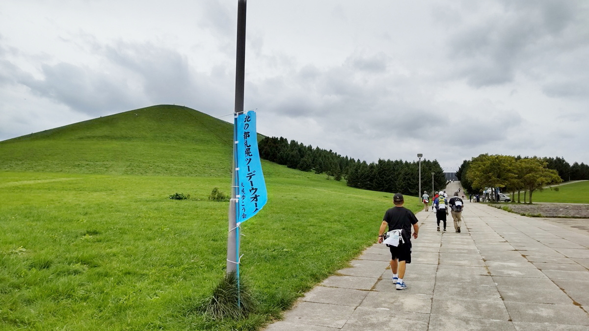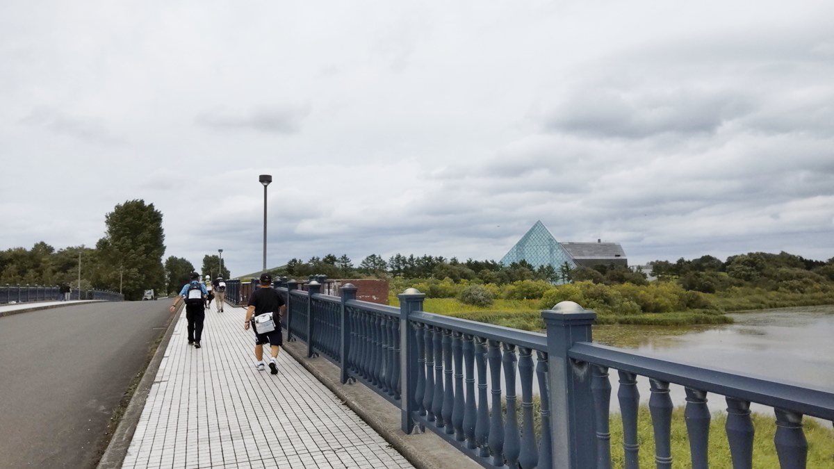 三角点通りからモエレ沼公園、サッポロさとらんどへと進みます。モエレ沼公園はガラスのピラミッドや人工の山、噴水などイサム・ノグチが設計した芸術的な景観が魅力です。「サッポロさとらんど」は牧場や花畑などで多くの家族連れが楽しんでいました。丁度疲れが出てきたころ、チェックポイントのバナナ、さとらんどのソフトクリームを堪能し、元気回復です。
