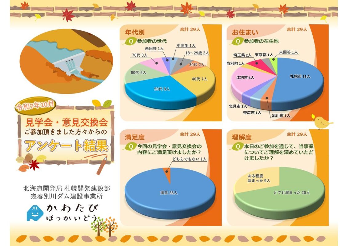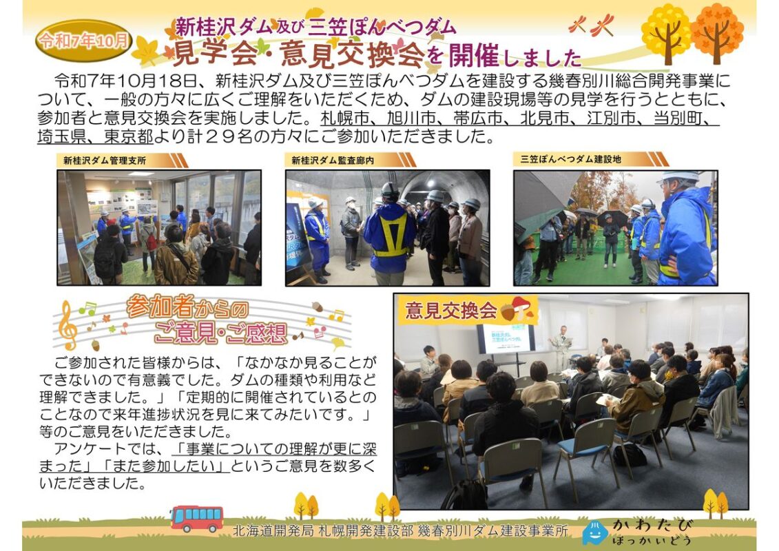 幾春別川ダム建設事業所は10月18日(土)に、令和6年3月に完成した新桂沢ダムと現在建設中の三笠ぽんべつダムの見学会及び意見交換会を開催しました!