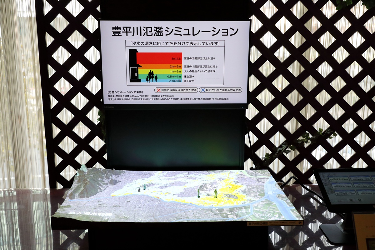 また、豊平川氾濫シミュレーションの装置も設置されました。浸水深の色分けや3Dの地形図に投影されるので、とてもリアリティがあります。普段は、札幌開発建設部1階に設置しています。