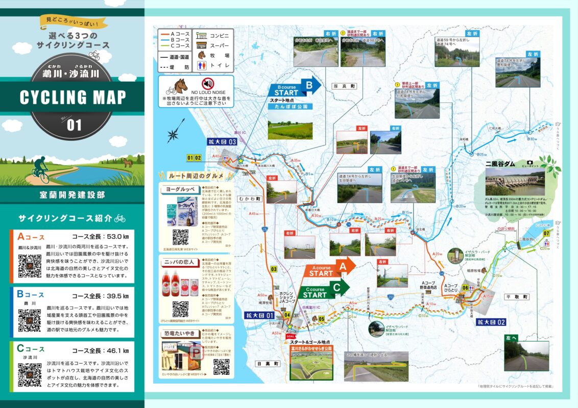 鵡川・沙流川の堤防天端や一般道路を利用して、鵡川沙流川で実施してきたサイクリング試走会での意見などを参考に、サイクリングマップを作成しました。