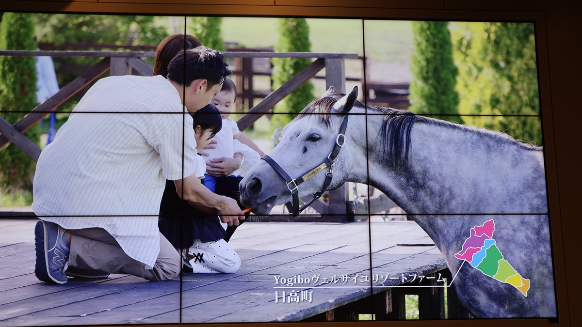 デジタルサイネージでは、yogiboヴェルサイユリゾートファーム(日高町)のお馬さんが映し出されていました。とても解像度が良くきれいです。