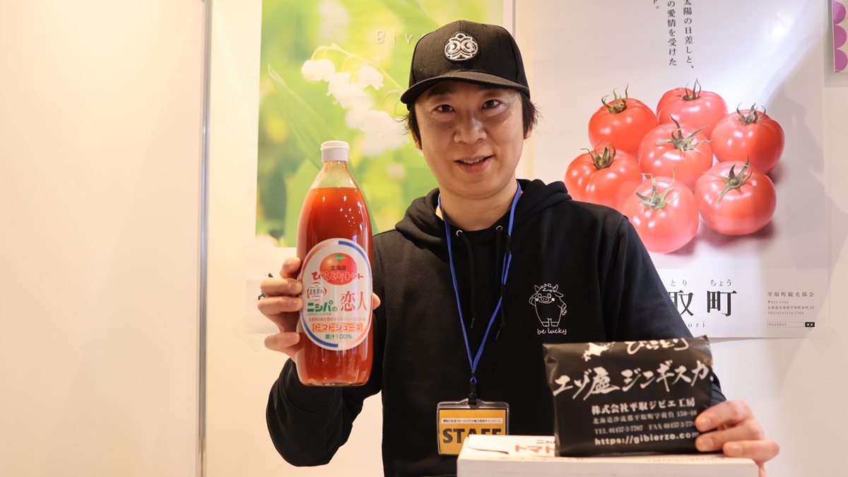 平取町からは、観光商工課のみなさんが、ニㇱパの恋人トマトジュース、エゾ鹿ジンギスカンのほか、びらとり和牛ハンバーグ、びらとり黒豚ハンバーグなど多くの特産品を販売していました。