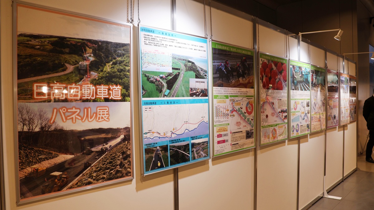 日高自動車道のパネル展です。競走馬の輸送、救急医療、農産物の安定供給など、地域には無くてはならない道路です。