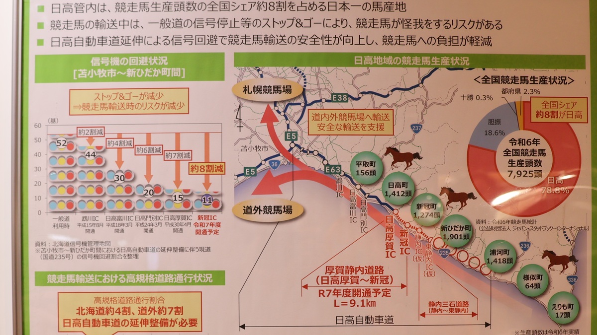 日高管内は、競走馬生産数全国シェア約8割を占める日本一の馬産地。一般道での輸送では、ストップ&ゴーによる怪我のリスクありますが、日高自動車道の延伸により、競走馬輸送の安全性が向上し、競争馬への負担が軽減されます。