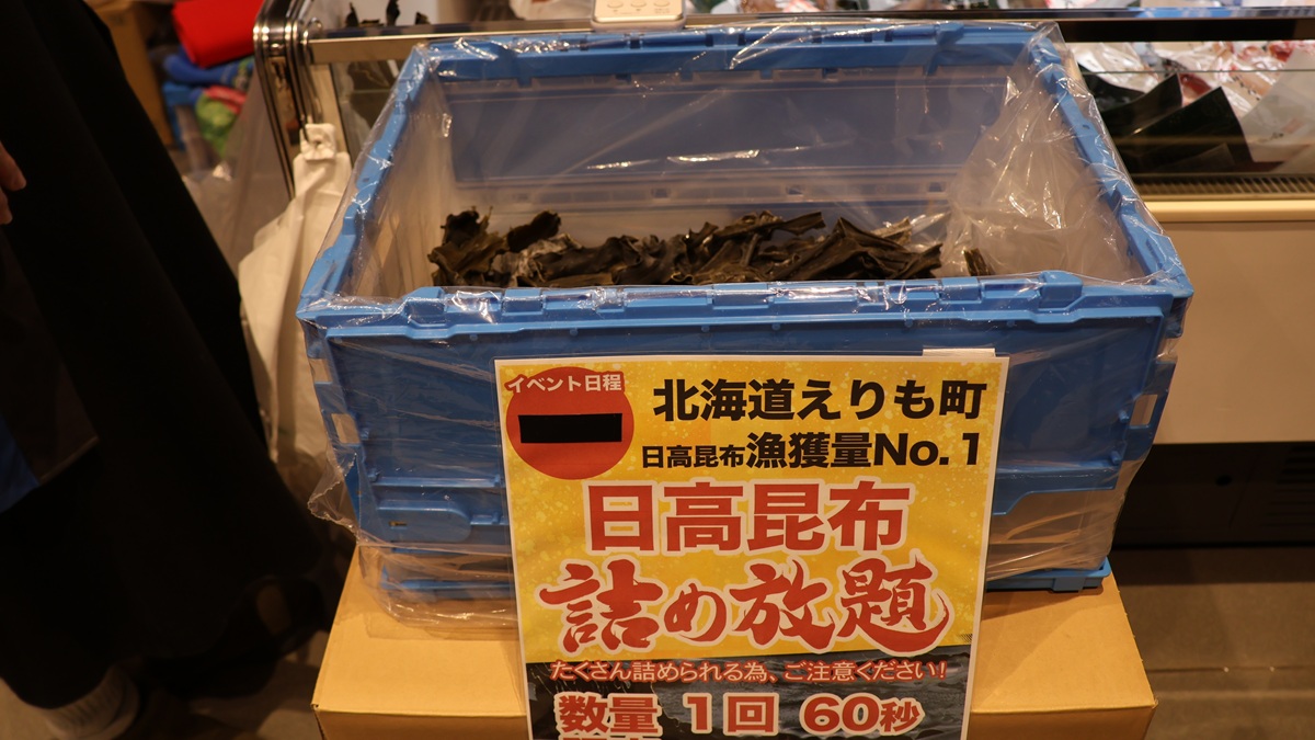 日高昆布の詰め放題が1回500円/60秒でチャレンジ!たくさん詰められて、みなさん満足そうでした。
