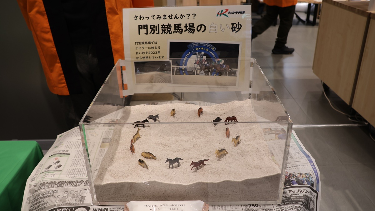 門別競馬場では、ナイターに映える白い砂を2023年から使用しています。さわってみたら、意外と軽くて、馬脚にもやさしいのかな。