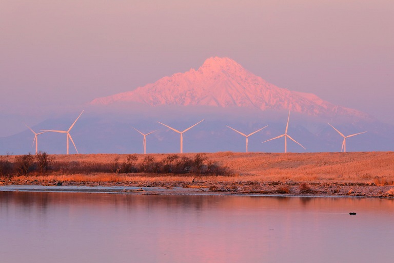 天塩川とオトンルイ風力発電所そしてピンク色に染まる利尻岳