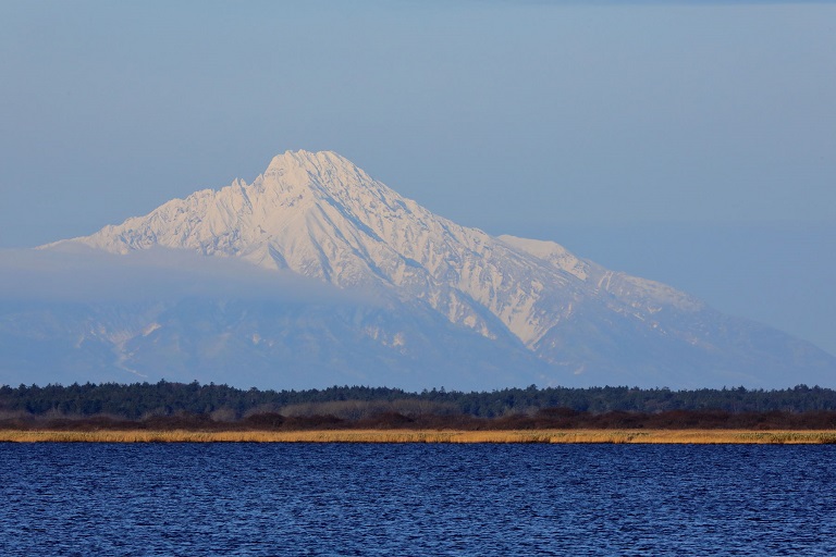 ピンク色に染まる冠雪した利尻岳を見たくて天塩川へ。朝お日様が地平線から上がるわずかな時間だけ反対方向の風景がピンク色に染まります。