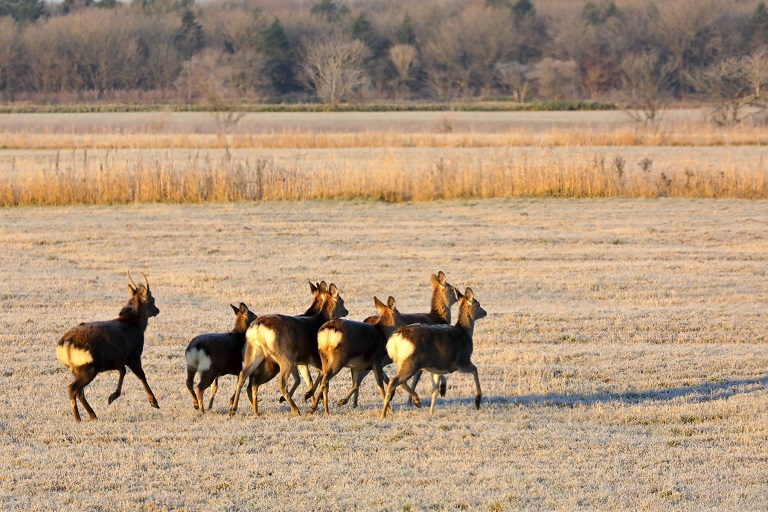 エゾシカ 幌延の朝霜が降りた牧草地にて