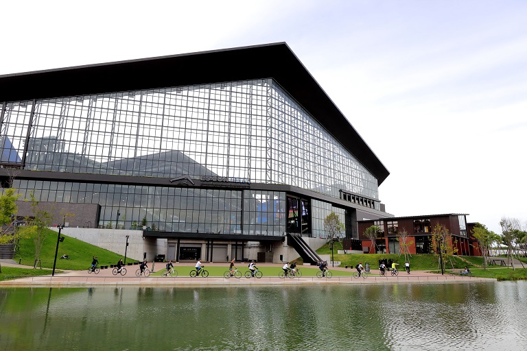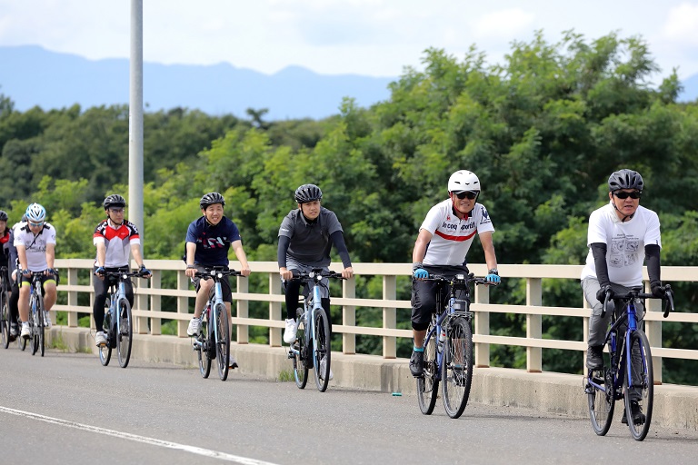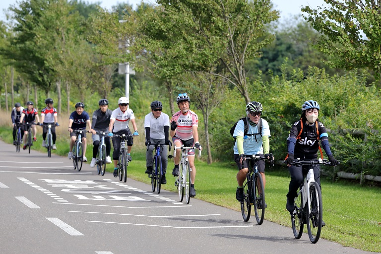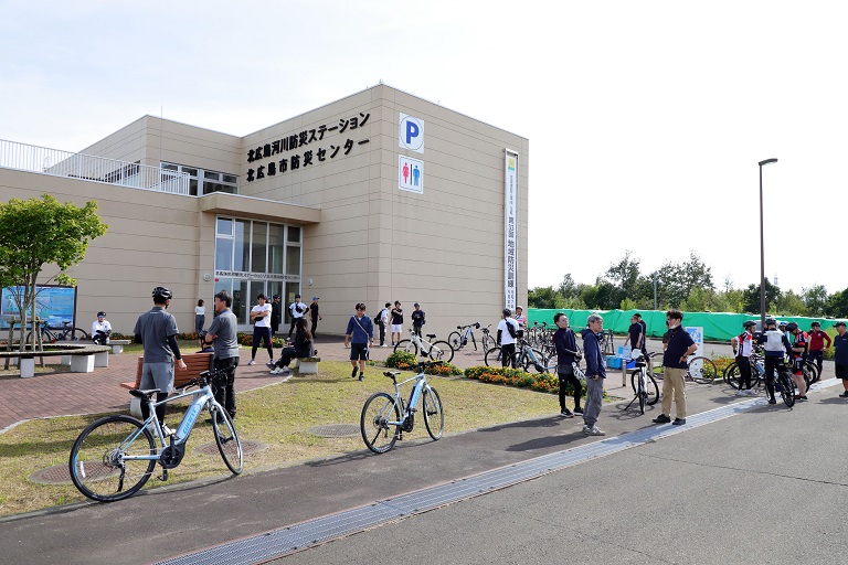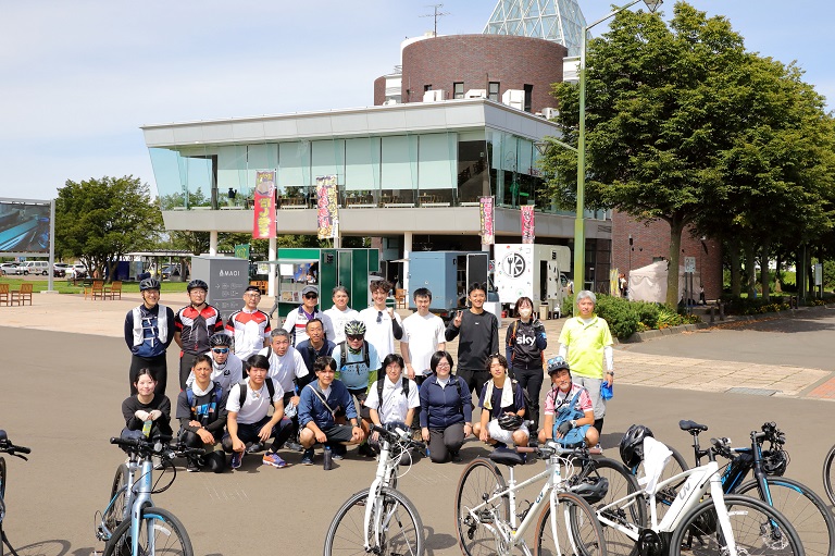 本走行会は石狩川流域圏ルートの検証、PR、モニタリングを主眼として例年開催され、今回は道と川の駅「花ロードえにわ」から道の駅「マオイの丘公園」、エスコンフィールドHOKKAIDOを経由してJR北広島駅に至る走行距離約57㎞のサイクリングとなりました。