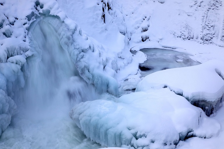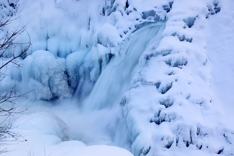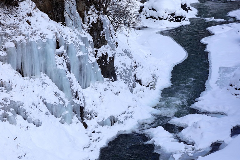 渚滑川は滝上町で美しい渓谷が見ることができます。春の新緑や秋の紅葉、冬は崖から染み出す水が凍りつき氷柱となり、洛陽の滝は結氷し氷のトンネルから渚滑川が激しく流れ出しています。