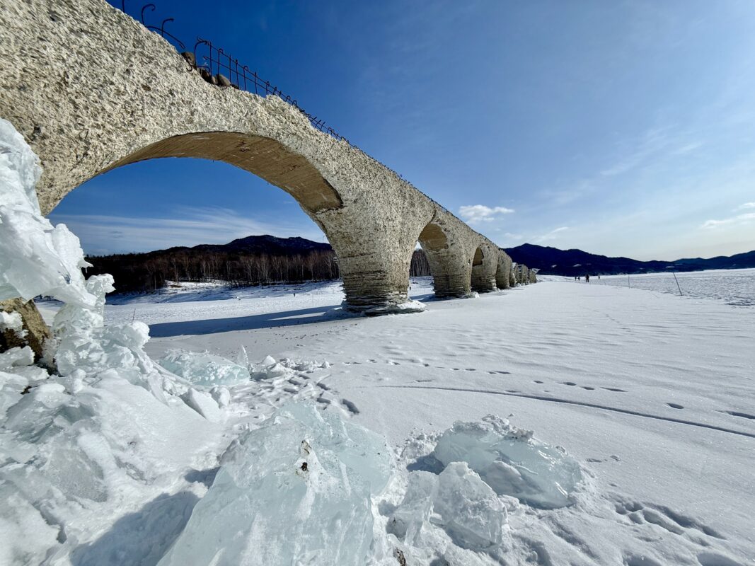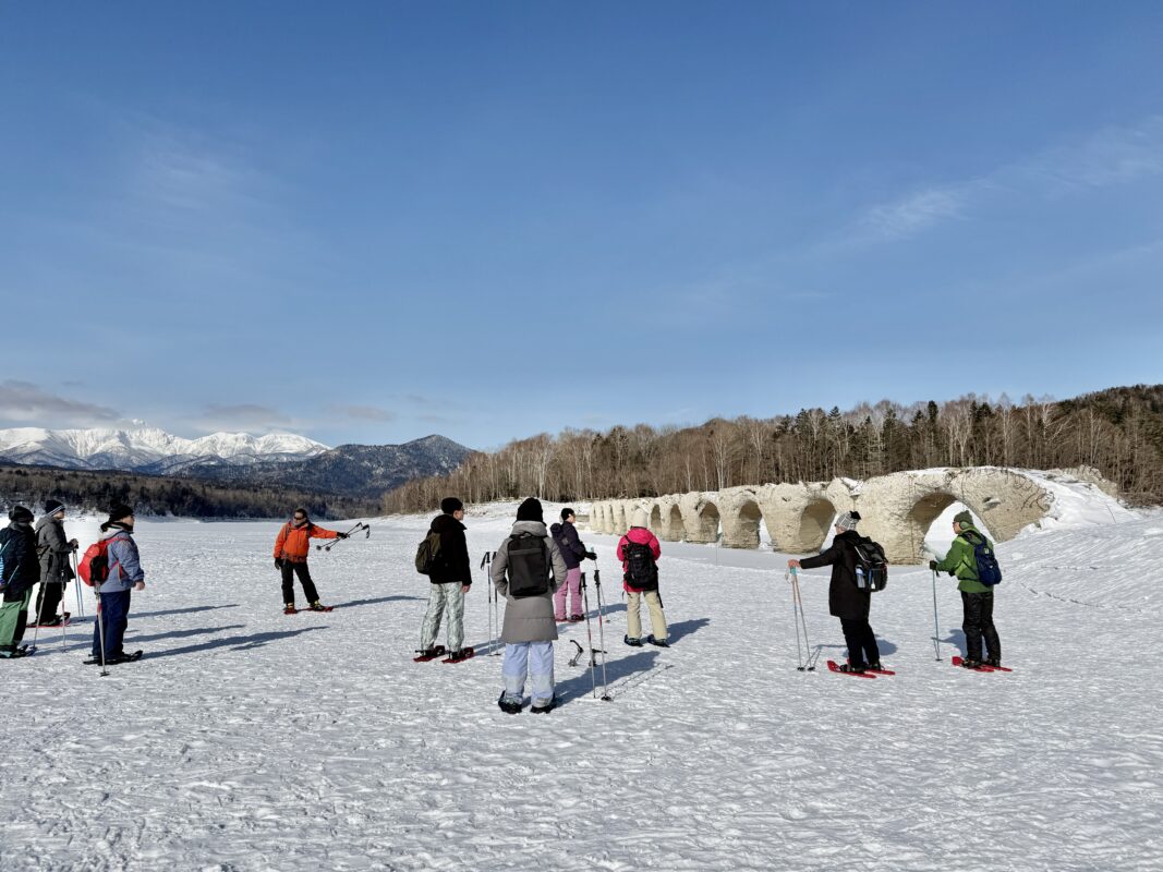 ツアー当日は、集合場所であるガイドセンターにてツアーの説明とスノーシューの履き方をレクチャーしてもらい、スタート地点である糠平湖五の沢まで車で約10ほど移動。ここから湖を目指し森の中へ踏み入る。雪化粧された大きな針葉樹の間を入り、圧雪や新雪を楽しみながらスノーシューハイクに慣れていく。時折鳥の声を聞き、立ち止まっては動物たち場所を探し説明を聞く。湖に近づくにつれ木々は大木から白樺へと変わっていき、いよいよ湖上へと降りていく。開けた雪原の湖上は北海道で3番目の広さでその周囲は東京の山手線の距離と同じというスケール感。大自然に圧倒されながら目的地のタウシュベツ橋までは片道約2km。雪原を慣れないスノーシューで歩くので天気に恵まれれば少し汗ばむぐらいのハイキング。途中、湖底から光合成によって発生するメタンガスが氷の中に閉じ込められた「アイスバブル」の撮影会も楽しみの1つ。タウシュベツ橋に着くと橋の説明を聞きその後は、フリータイムで好きな場所から橋を楽しむ。人気の撮影スポットはタウシュベツ橋を回り込み山々をバックに従えるロケーション。壮大な存在感の自然と朽ちていくアーチ橋のはかなさとの対比が橋の魅力をさらに高める。2026年シーズンは湖の水量が豊かなこともあり2月いっぱいまでは楽しそうとのこと。詳しくは「ひがし大雪自然ガイドセンター」へ。