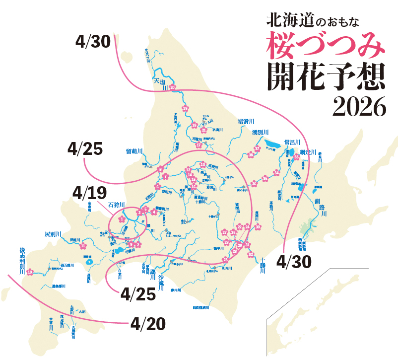 「桜づつみ」というワードをご存知ですか? 洪水から堤防を守ることに加え、人々が親しみやすい水辺の空間づくりに一役買う桜並木のことです。川沿いに吹くみずみずしい風と美しい桜色を楽しめることから、春を感じる散歩道として北海道民にも広く愛されています。桜前線2026(さくら開花予想)とあわせ、道内各地の主な桜づつみをご紹介!(今年1回目の公表)