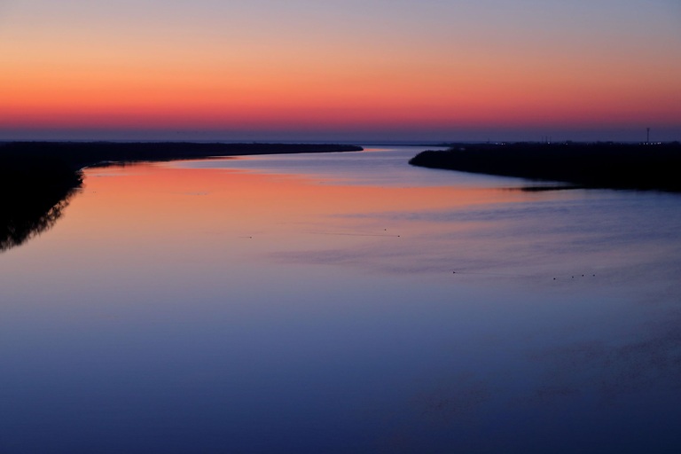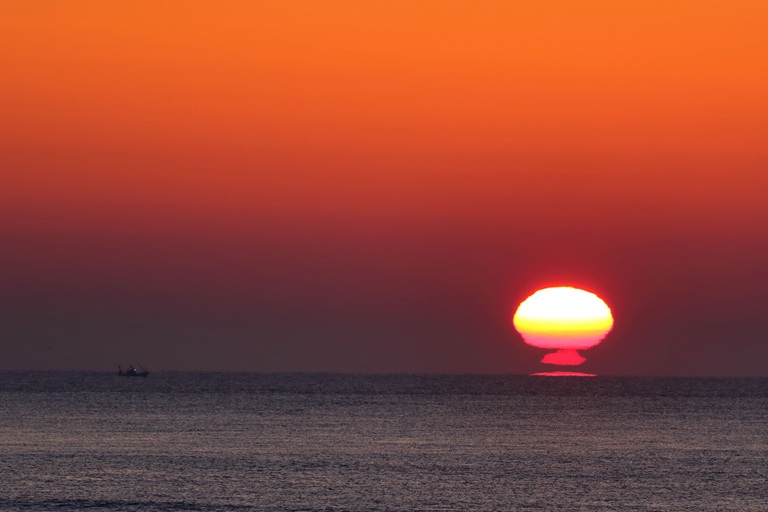 よく晴れた穏やかな朝、十勝河口橋から見る十勝川は青色のグラデーションに赤色の絵具をこぼしたような光景がゆったりと河口に向かって流れていた。暫く佇んでいたが我に返り日の出を見るため河口へ、少し日の出が河口からずれて昇ってきたが太平洋から上がったお日様はいろいろな姿に変え楽しませてくれた。