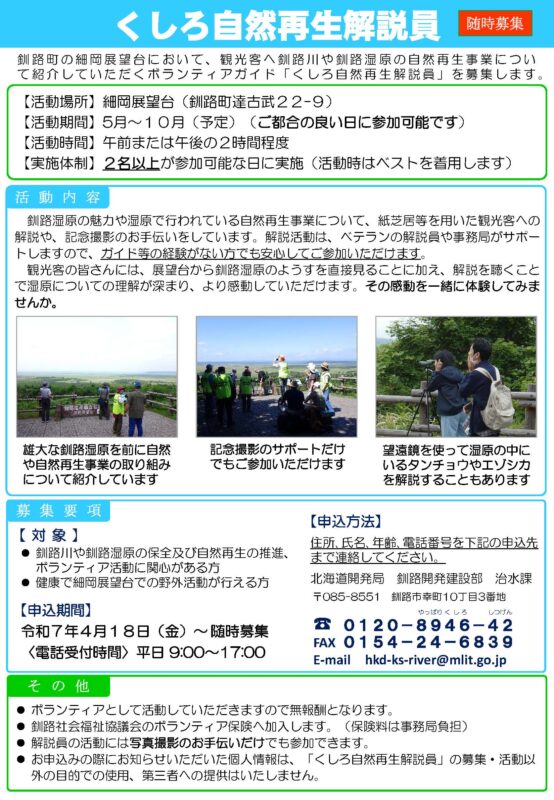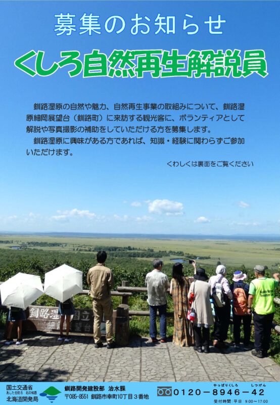 釧路湿原のワイズユース※(賢明な利用)による保全と利用の両立を目的として、釧路湿原や釧路湿原自然再生事業について、国内外からの観光客に解説していただく、ボランティアガイド「くしろ自然再生解説員」を募集します。釧路湿原に興味がある方であれば、知識・経験に関わらずご参加いただけます。