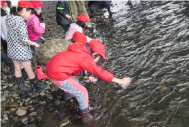 毎年春に、恵庭市内の小・中学校で飼育したサケの稚魚を漁川(いざりがわ)に放流しています。当日は幼稚園児も含めたくさんの子どもたちが参加し、3~4年後に漁川に戻ってくることを楽しみにしています。