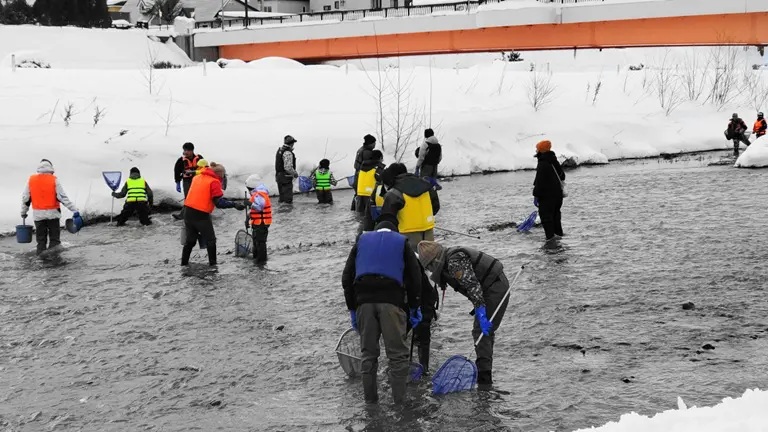 冬のかわ塾では、他では体験できない冬ならではの景色の中、冬の寒いときに魚たちはどんなところにいるのか、極寒の漁川で冬のいきものやサケの稚魚がいるか調べます。