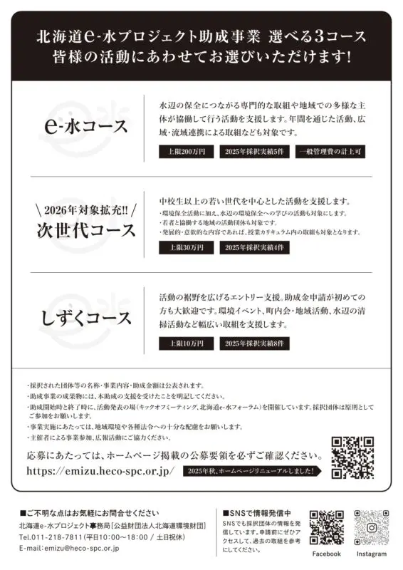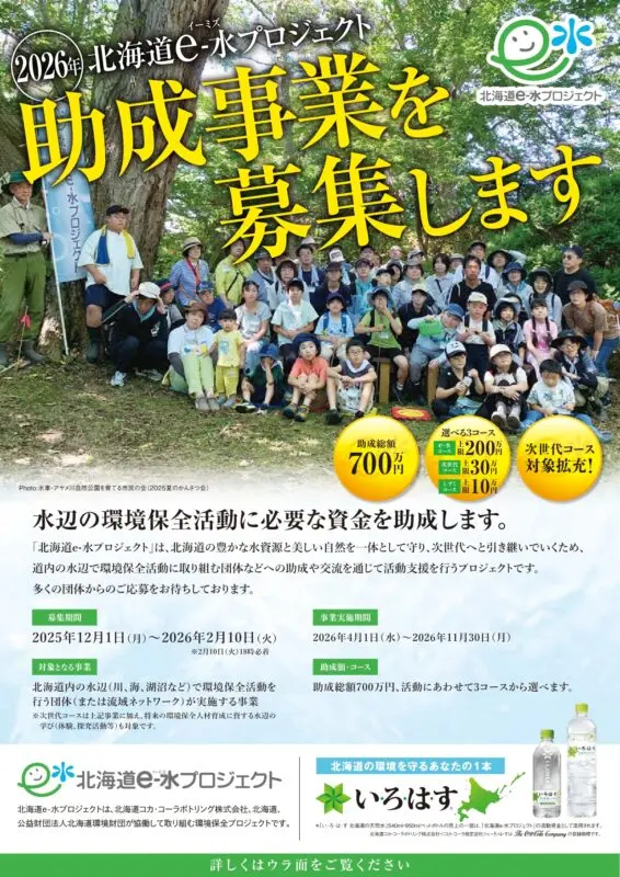 「北海道e-水プロジェクト」は、北海道の豊かな水資源と美しい自然を 一体として守り、次世代へと引き継いでいくため、道内の水辺での環境 保全活動に取り組む団体などへの助成や支援を行うプロジェクトです。