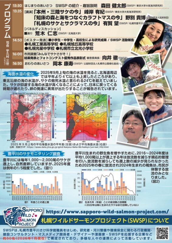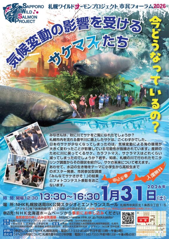 豊平川に野生サケを増やす活動を行っている札幌ワイルドサーモンプロジェクト(SWSP)・札幌市豊平川さけ科学館・NHK放送局が主催する、市民フォーラムです。