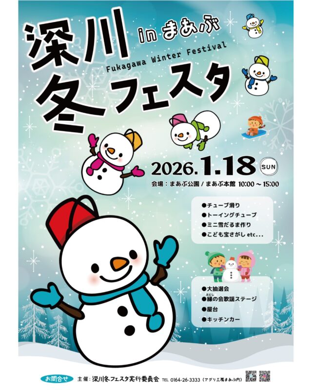 「ふかがわ氷雪まつり」は、「深川冬フェスタinまあぶ」として開かれることになりました。 「チューブ滑り」やスノーモービルでゴムチューブを引っ張る「トーイングチューブ」など、子どもたちが楽しめるイベントや大抽選会、市内飲食店によるキッチンカーと屋台が出店される予定です。