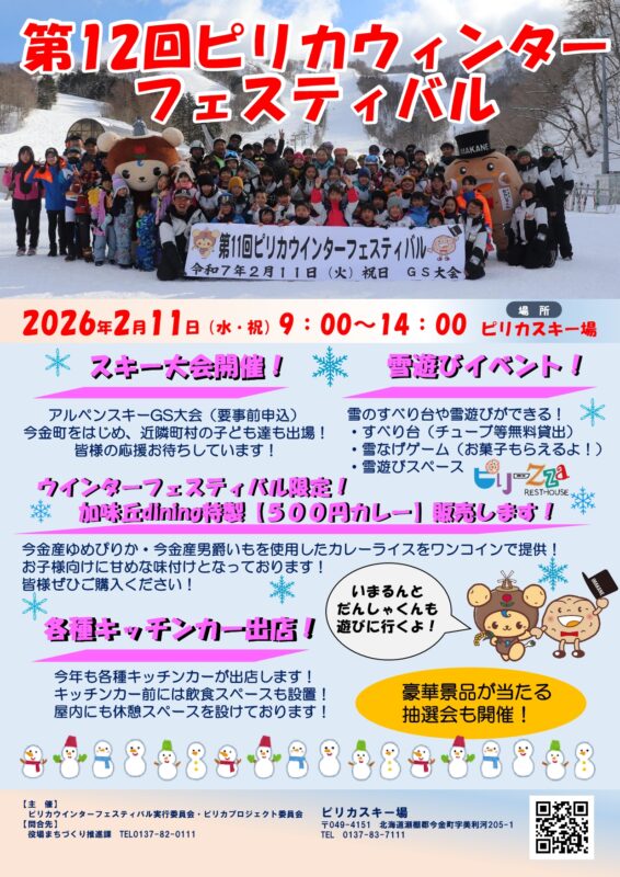 美利河ダムからすぐ近くのピリカスキー場を会場に、アルペンスキーGS大会と同日に毎年大人気の「第12回ピリカウィンターフェスティバル」が開催されます。お子さん向けのゲームやタイヤチューブ滑り台、イベント限定商品の販売に人気のキッチンカーも来ますので、遊び+食+温泉をお楽しみください。