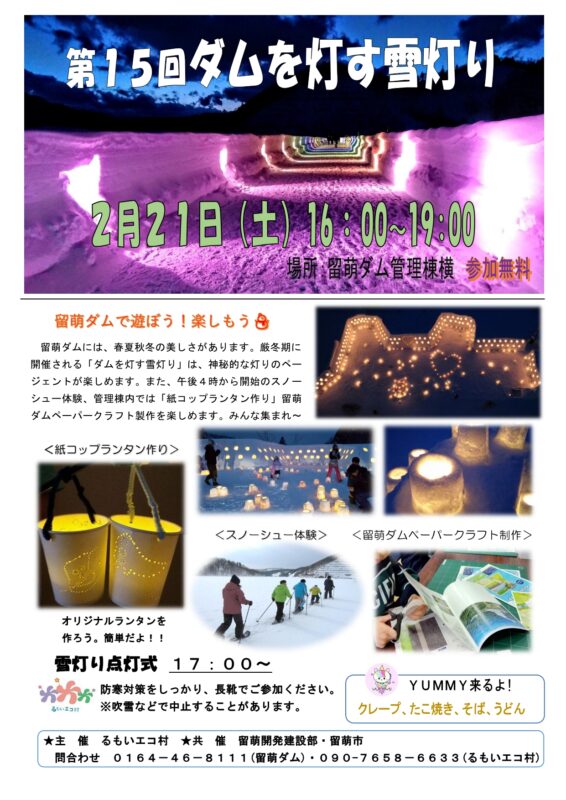 厳冬期に開催される「ダムを灯す雪灯り」は、神秘的な灯りのページェントが楽しめます。留萌ダムへぜひお越しください。