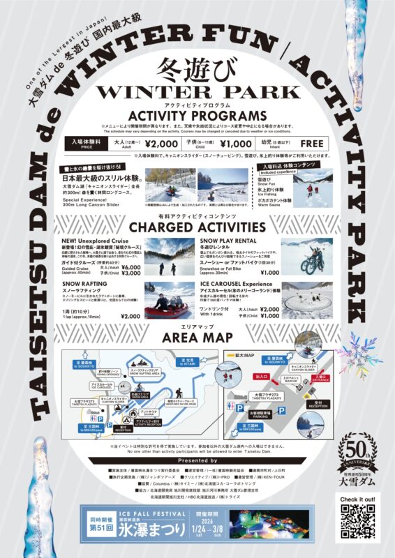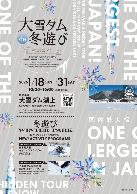 日本最大級の大雪山国立公園内で 楽しむことができる 、冬期 アクティビティイベントが北海道上川町の大雪ダムで開催されます。4年目となる今回は、「国内最大級!となる全長約300mのキャニオンスライダー(チュービングパーク) 」 や未開拓のダム湖 奥地での「幻の雪庇・湖氷観賞秘境ネイチャークルーズツアー」が 新登場!