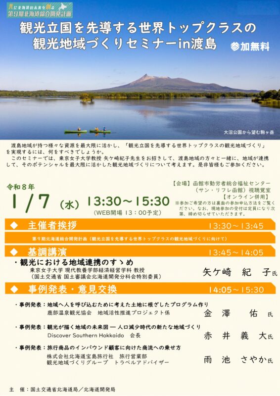 本セミナーでは、渡島地域の方々と一緒に観光地域づくりについて考えます。