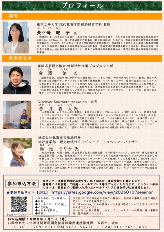 国土交通省北海道局及び北海道開発局では、第9期北海道総合開発計画において主要施策として掲げている「観光立国を先導する世界トップクラスの観光地域づくり」に向けた取組として、東京女子大学教授 矢ケ崎紀子氏をお招きし、下記のとおりセミナーを開催します。