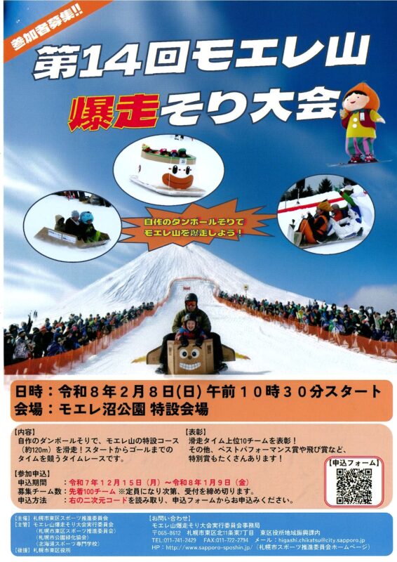 モエレ山爆走そり大会は、ダンボールの自作そりでモエレ山を滑走する競技で、スタートからゴールまで(およそ120メートル)の滑走タイムを競います。友人同士、親子、職場の仲間などでの参加です。