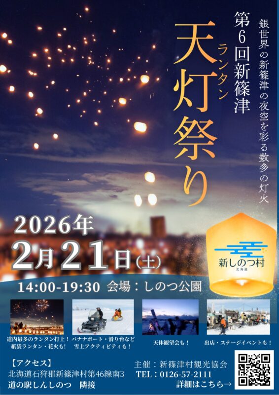 幻想的な新篠津天灯(ランタン)祭り。地元の人々や観光客が集まり、地中で分解されるエコなランタンに自分の希望や夢を描き、火を点けると温かい空気が溜まり、空に放たれ、夜空を輝かせ、きらめかせ、冬の新篠津の原野を幻想的な光景に変えます。地元の学校の子供たちや村人たちが作った美しい紙袋ランタンのきらめく光景、生演奏の音楽、美味しい食べ物、飲み物を楽しむことができます。子供向けの雪のアクティビティやゲームもあり、大感動間違いなしの一日に!