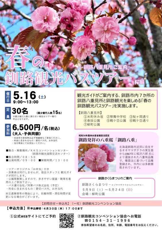 釧路発祥の八重桜「釧路八重」、その中でも釧路市内7か所の見所にスポットを当て、観光ガイドと巡ります。申込締切は4月30日(木)まで。