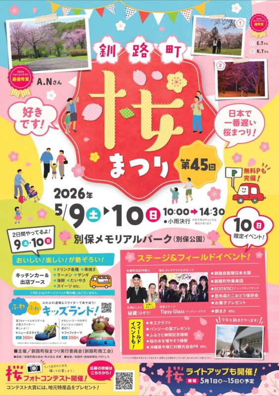 今年で、45回を迎える桜まつり。会場となる別保公園には、約700本のエゾヤマザクラ、クシロヤエザクラが咲きます。キッチンカーやテント販売、ふわふわ遊具の営業、ステージイベント等も予定されています。